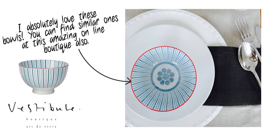A simple natural cord place mat, can be used in several settings because it is NEUTRAL. Natural linen runners or table cloths are an excellent jumping off point! The key is building and creating layers, to give depth and movement to your table. In these settings I used beautifully patterned bowls to bring color and pattern; I purchased the bowls at the wonderful «ESPACE RICARDO» boutique.